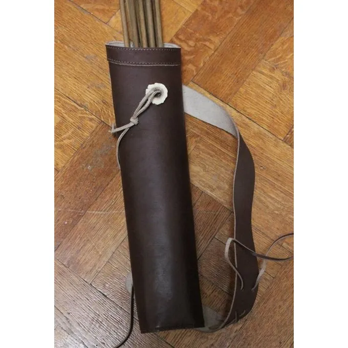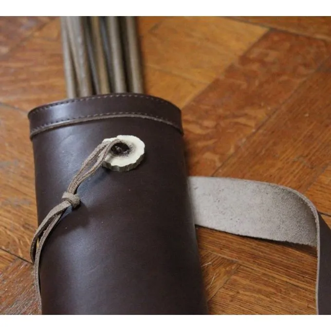 Deze pijlenkoker is geheel handgemaakt en bestaat uit leer en hoorn. Hij is 45 cm lang en 9 cm breed.