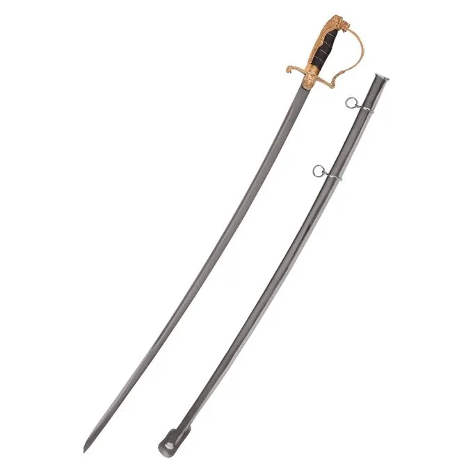 Deze sabel heeft een geschroefde pommel. De pareerstang en de pommel zijn gemaakt van goudkleurig messing. De pommel heeft de vorm van een leeuwenkop en de leeuw heeft roodkleurige ogen van ingelegd glas. Ook de pareerstang toont een leeuwenkop en verschillende organische decoraties in de vorm van bladeren, ranken en een vogel. De grip is gemaakt van hout en is omwikkeld met zwart leer en messing draad. De sabel wordt geleverd inclusief een stalen schede met riemlussen.