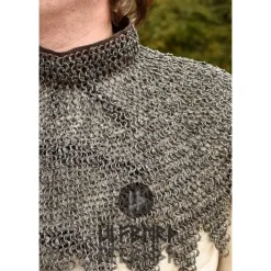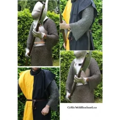 Tip: door leren veters aan de gambeson te bevestigen kan de mantel (nekstuk) van deze maliënkap beter op zijn plek worden gehouden.