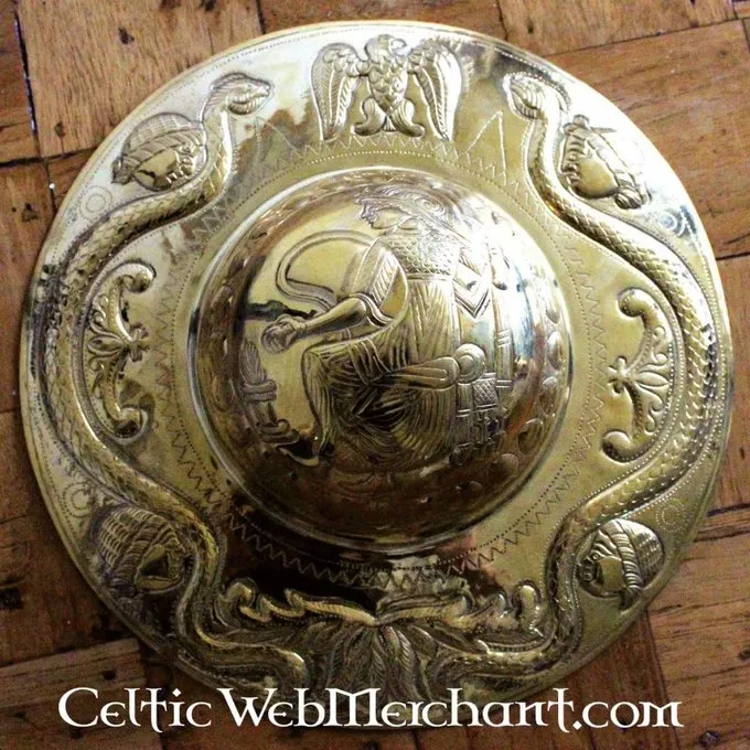 Deze ronde schildknop is een replica van een origineel uit de Guttmanncollectie en biedt ideale stevigheid aan het schild. De schildknop heeft en diameter van 24 cm. Hij is met de hand gemaakt.