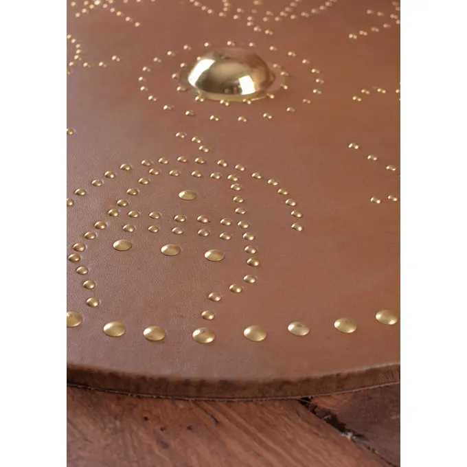 De targe is gemaakt van hout en overtrokken met leer. Het leer wordt verstevigd door de decoratieve nagels. Hij is voorzien van een schildknop, waarachter het handvat bevestigd zit.