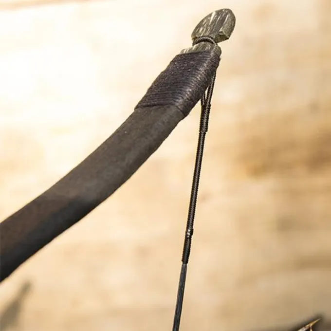 Materiaal: glasvezel, velours-leer, hout / / Kleur: zwart / / Lengte ongespannen: 107 cm / / Lengte gespannen: 94 cm / / Trekkracht 24-26 lbs / / Geschikt voor LARP en re-enactment / / Geleverd inclusief pees en hoes / / Gebaseerd op een historisch origin