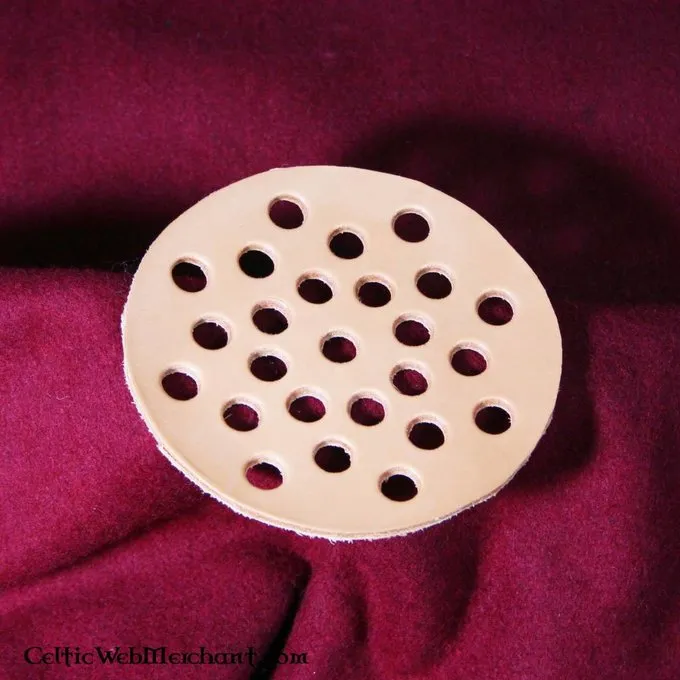 Leren schijven werden tussen de 12de en 16de eeuw gebruikt in linnen pijlenkokers. Replica van een exemplaar teruggevonden in de Mary Rose