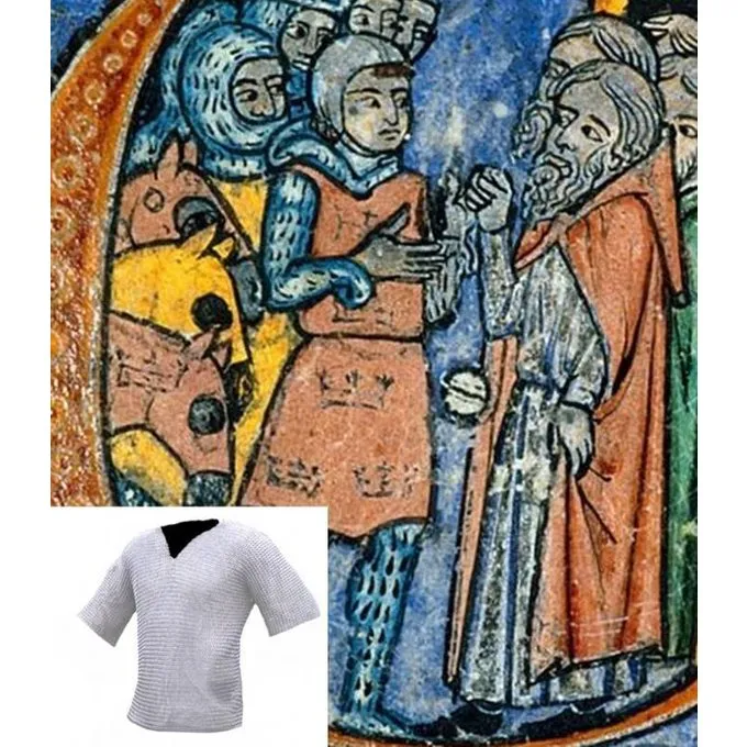Deze maliënkolder is gemaakt van 1,6 mm dikke, verzinkte, ongeklonken ronde ringen met een binnendiameter van 8 mm. De ringen zijn met de hand vier in één gevlochten. De maliënkolder heeft halflange mouwen en komt tot iets over de heup.