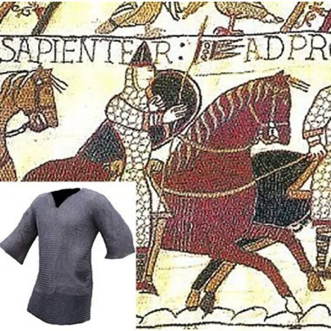 Deze maliënkolder is gemaakt van platte ringen, geklonken met wigvormige klinknagels, en ongeklonken ronde ringen. Ze zijn 4 in 1 gewoven en hebben een binnendiameter van 8 mm. De maliënkolder heeft halflange mouwen en komt tot net over de heup.