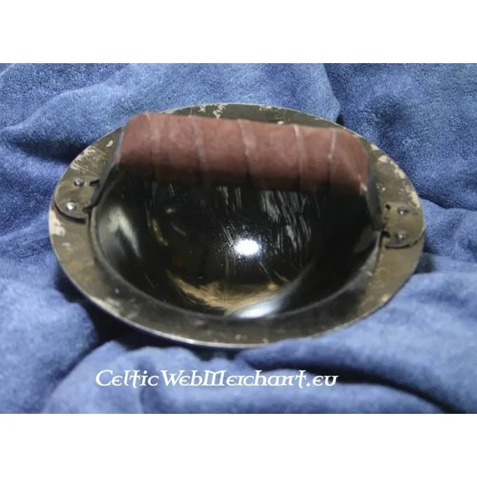 Deze beukelaar is gemaakt van 2 mm dik staal. Hij heeft een diameter van 16,5 cm en weegt 0,55 kg. De grip is met leer omwikkeld.