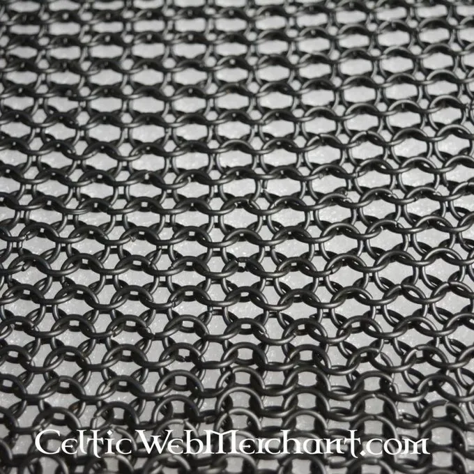 Dit maliënstuk is gemaakt van 1,6 mm dikke, donkere ringetjes met een binnendiameter van 8 mm, die zijn dichtgeknepen. Het stuk is handig voor reparaties of het vervaardigen van eigen maliënproducten. Het kan bijvoorbeeld op een wambuis gestikt worden. Het maliënstuk is 20 x 20 cm en weegt 0,3 kg.