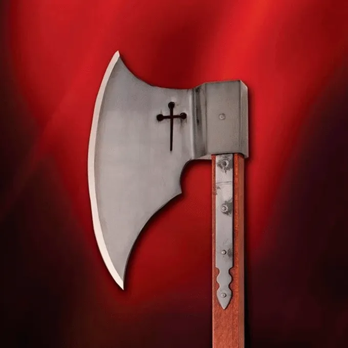 Een prachtige bijl van Windlass Steelcrafts, gebaseerd op middeleeuwse bijlen die de kruisridders gebruikten tijdens hun kruistochten naar het Heilige Land. Middeleeuwse bijlen waren geschikt als wapen om plaatpantser mee te doorboren, maar ook als gereedschap te gebruiken onderweg. Het grote bijlblad met kruis is stevig vastgemaakt aan de schacht met nagels. De grip heeft zwart leer en ligt comfortabel in de hand. Al het metaal heeft een gepatineerde afwerking zodat het net een antieke bijl lijkt. Deze bijl is gemaakt van semi-scherp 1065 koolstofstaal getemperd tot een hardheid van 48-52 HRC. Hij wordt geleverd inclusief een leren hoes. Een mooie middeleeuwse bijl voor je verzameling of voor middeleeuwse reenactment. Wanneer je de bijl afbot, kan je hem gebruiken voor reenactment battles.